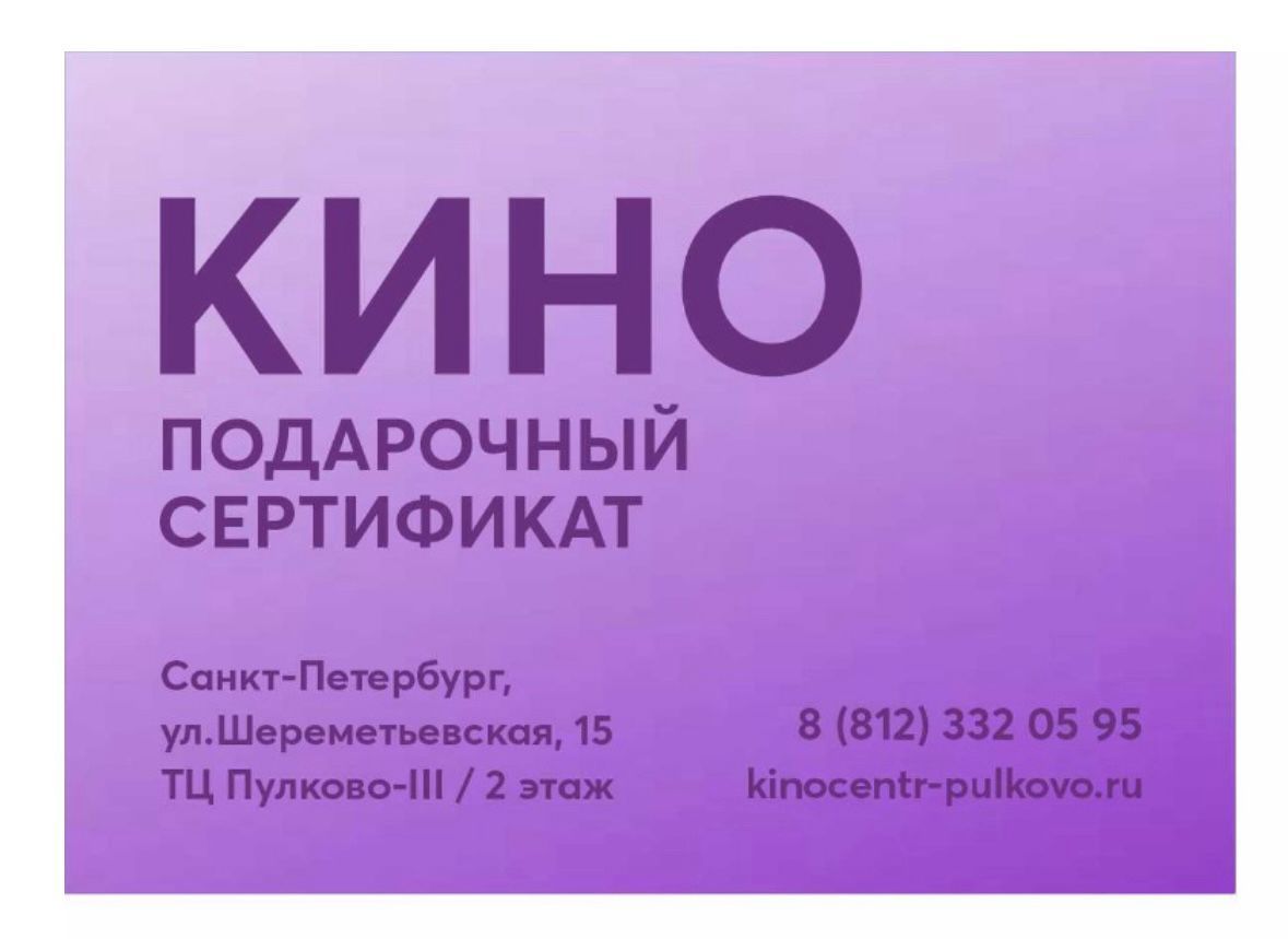 Сертификат подлежит обмену на любой билет в кинотеатр, на любой сеанс из репертуара,
